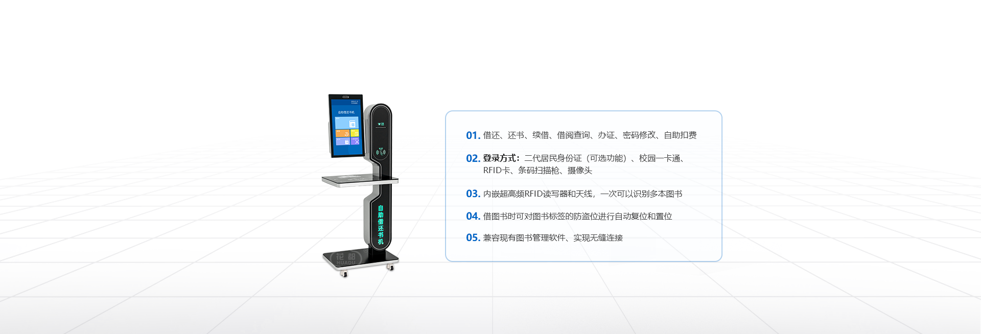 自助借還書一體機簡化了流通處理流程,將人工借還改為自助借還,提升圖書館讀者借閱效率,降低圖書管理員的工作強度。具備自助借書、還書、續借和逾期查詢功能,可對有標簽的圖書進行掃描、識別和歸還處理。